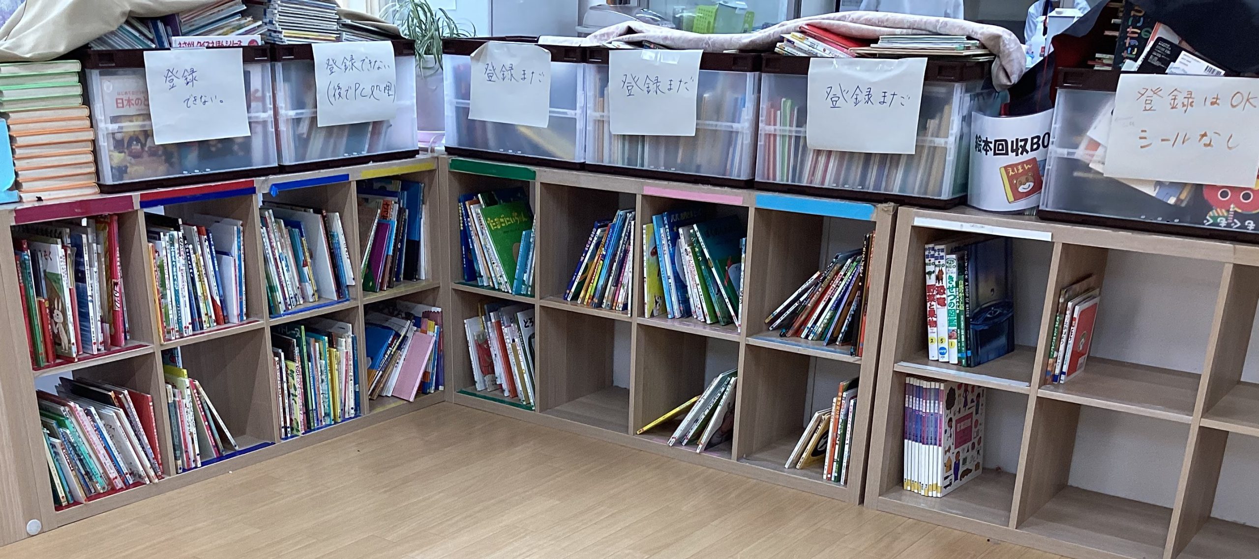 園内全ての絵本を登録していきながら同時に棚に戻していく・・・という根気のいる作業(゚Д゚;)